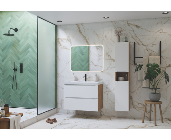 Breng warmte en stijl in je badkamer met de onderkast Dion. De natuurlijke eikenhouten afwerking in combinatie met de strakke witte fronten zorgt voor een moderne en frisse uitstraling die in vrijwel elk interieur past.