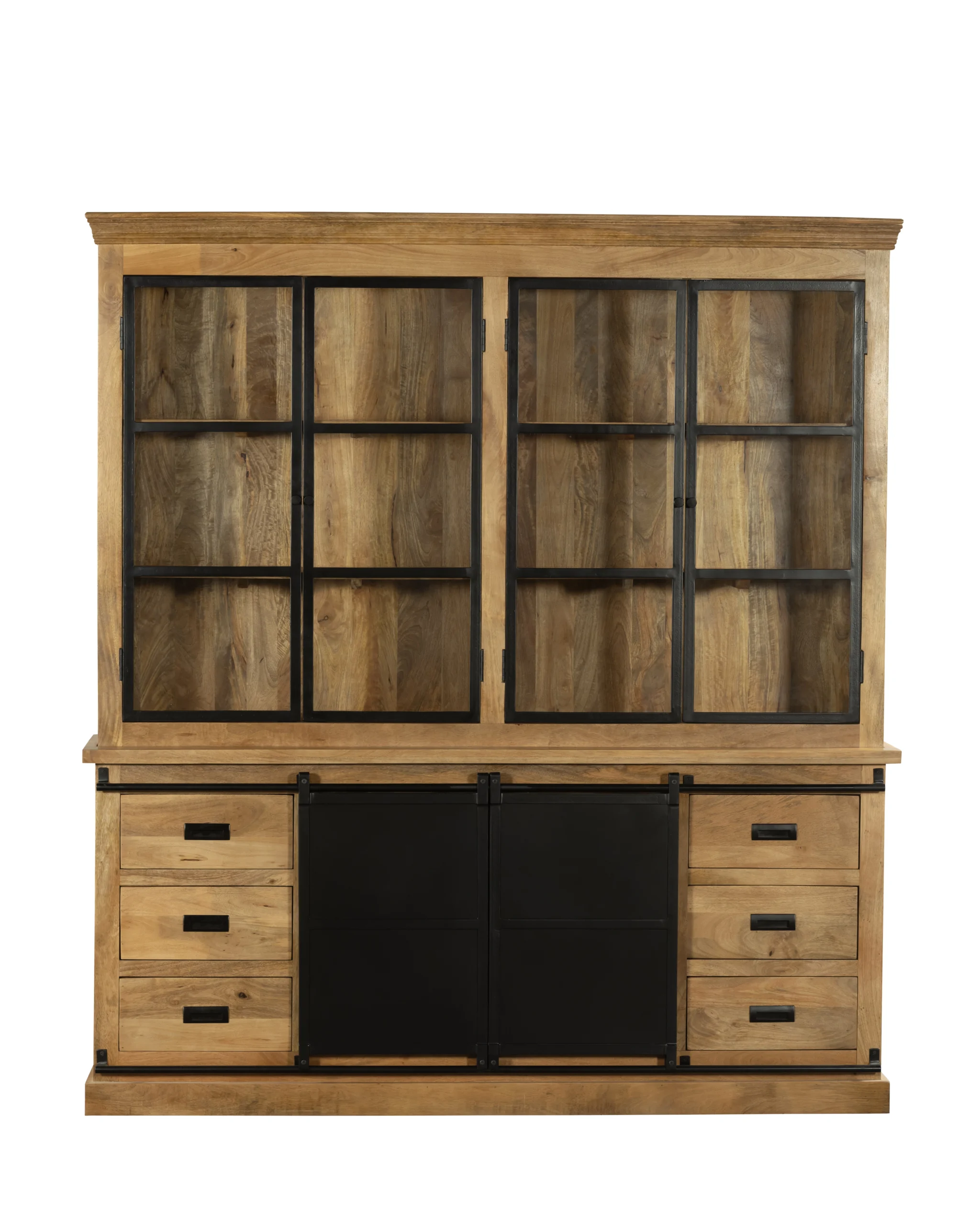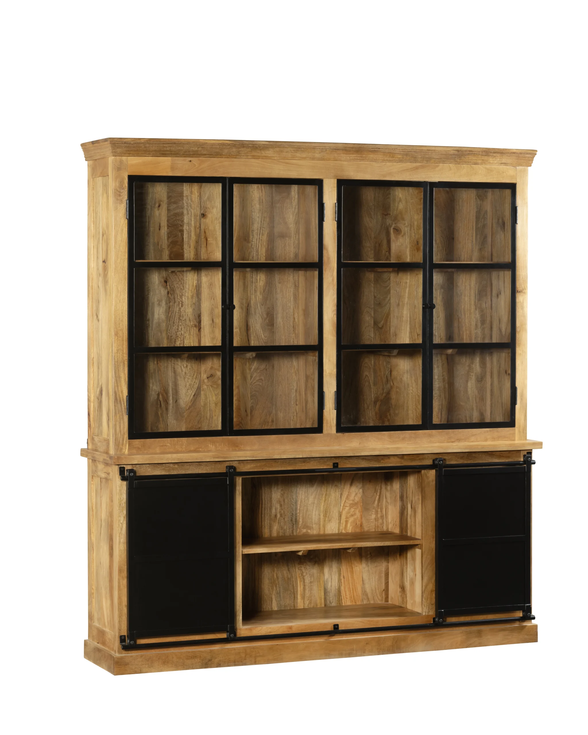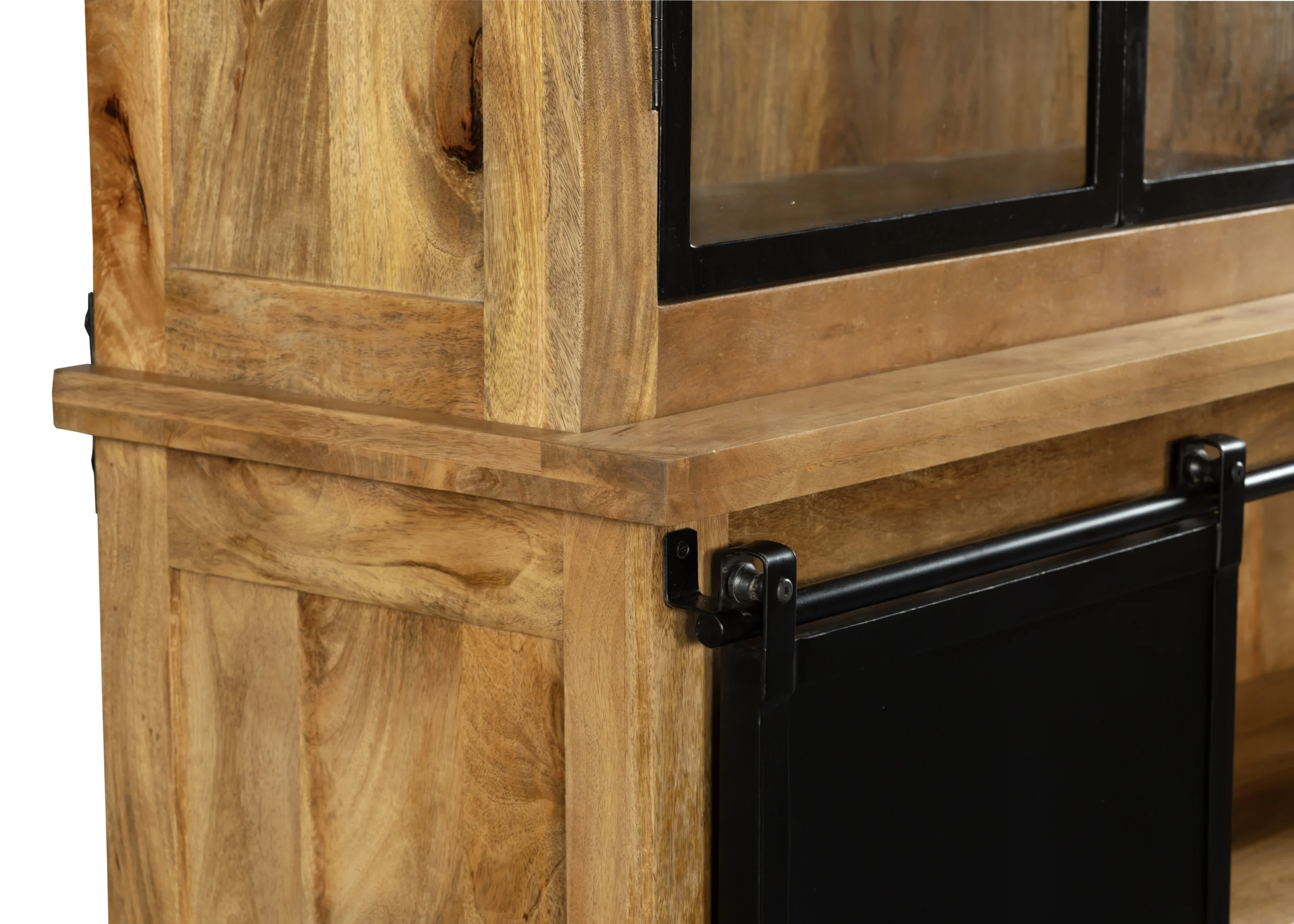 Het massieve mangohout zorgt voor warme kleurtonen, terwijl het zwarte stalen frame en de schuifdeuren een stoer karakter geven.