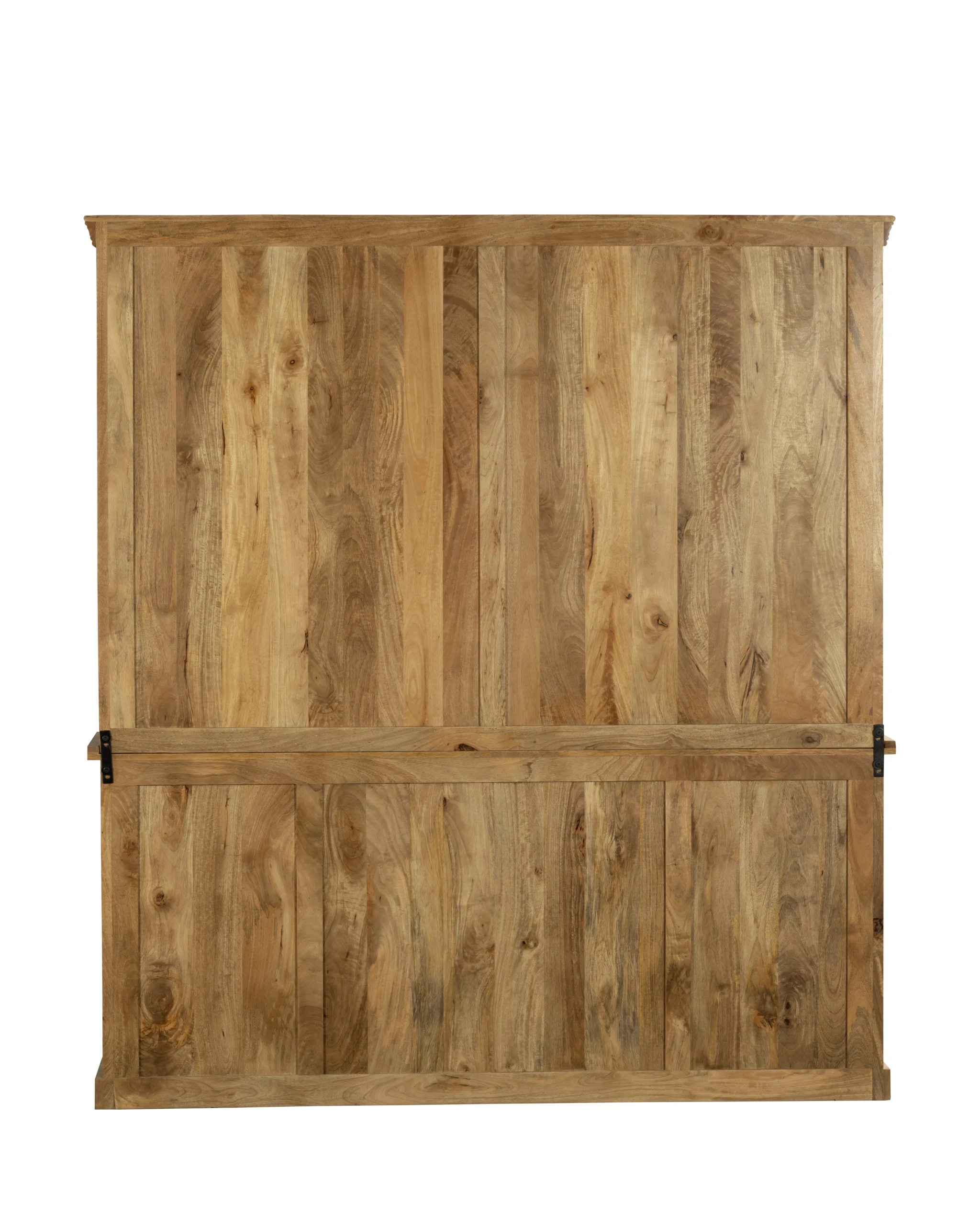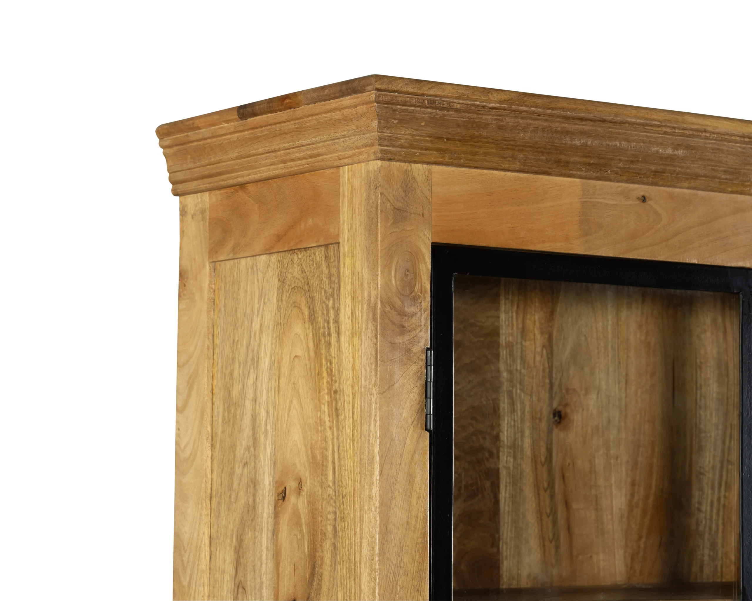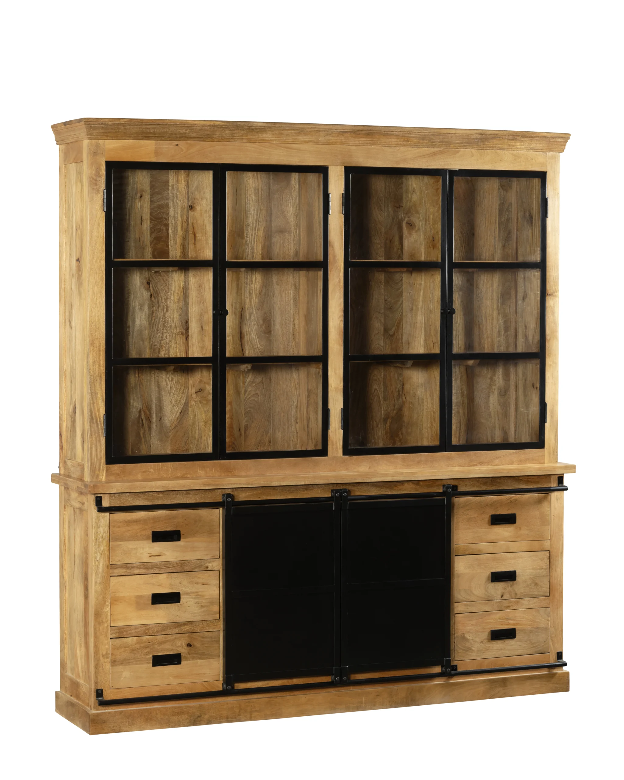 Het massieve mangohout zorgt voor warme kleurtonen, terwijl het zwarte stalen frame en de schuifdeuren een stoer karakter geven.