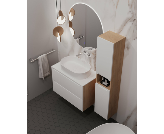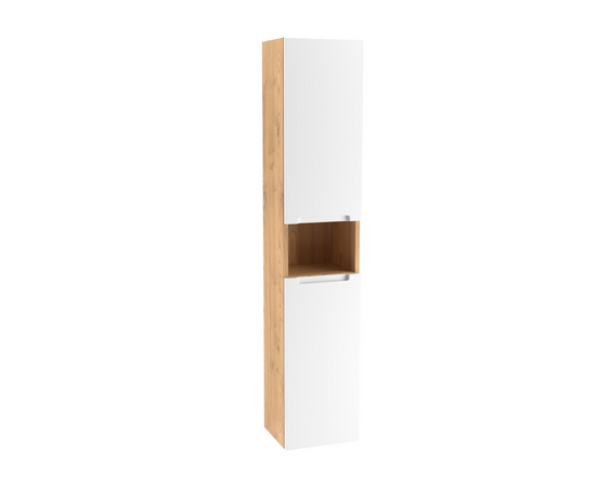 Breng stijl en functionaliteit samen in je badkamer met de Dion hoge badkamerkast. Deze kast combineert een moderne witte afwerking met warme eikenkleurige accenten, waardoor hij perfect past in zowel een moderne als een natuurlijke badkamerstijl.