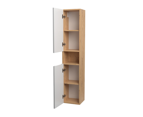 De hoge kast biedt ruime opbergruimte achter de deuren en in de open vakken – ideaal voor handdoeken, verzorgingsproducten en andere badkamerbenodigdheden.