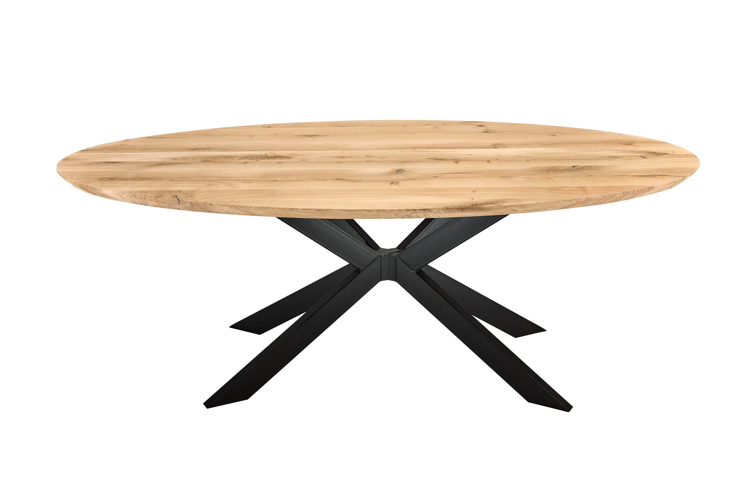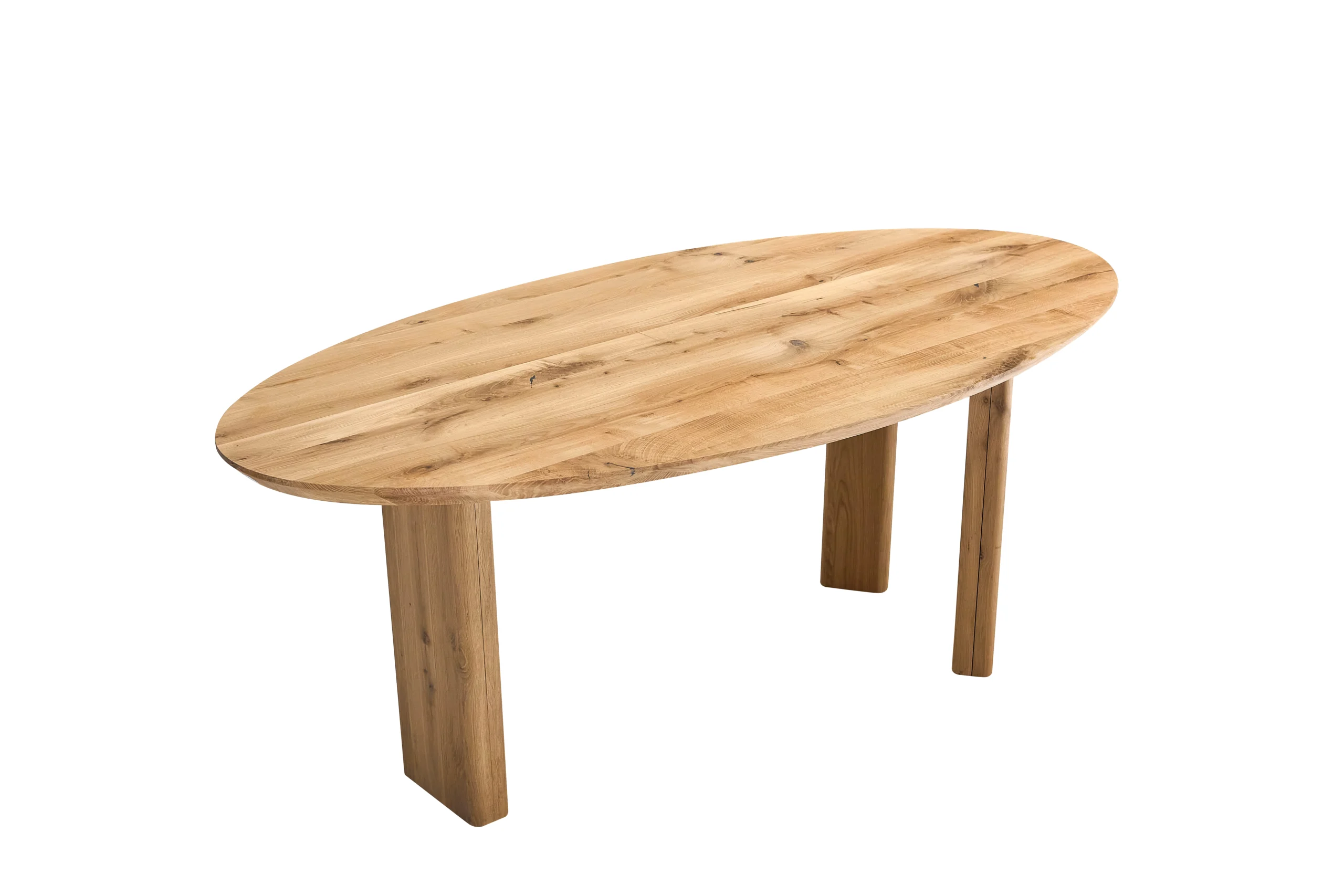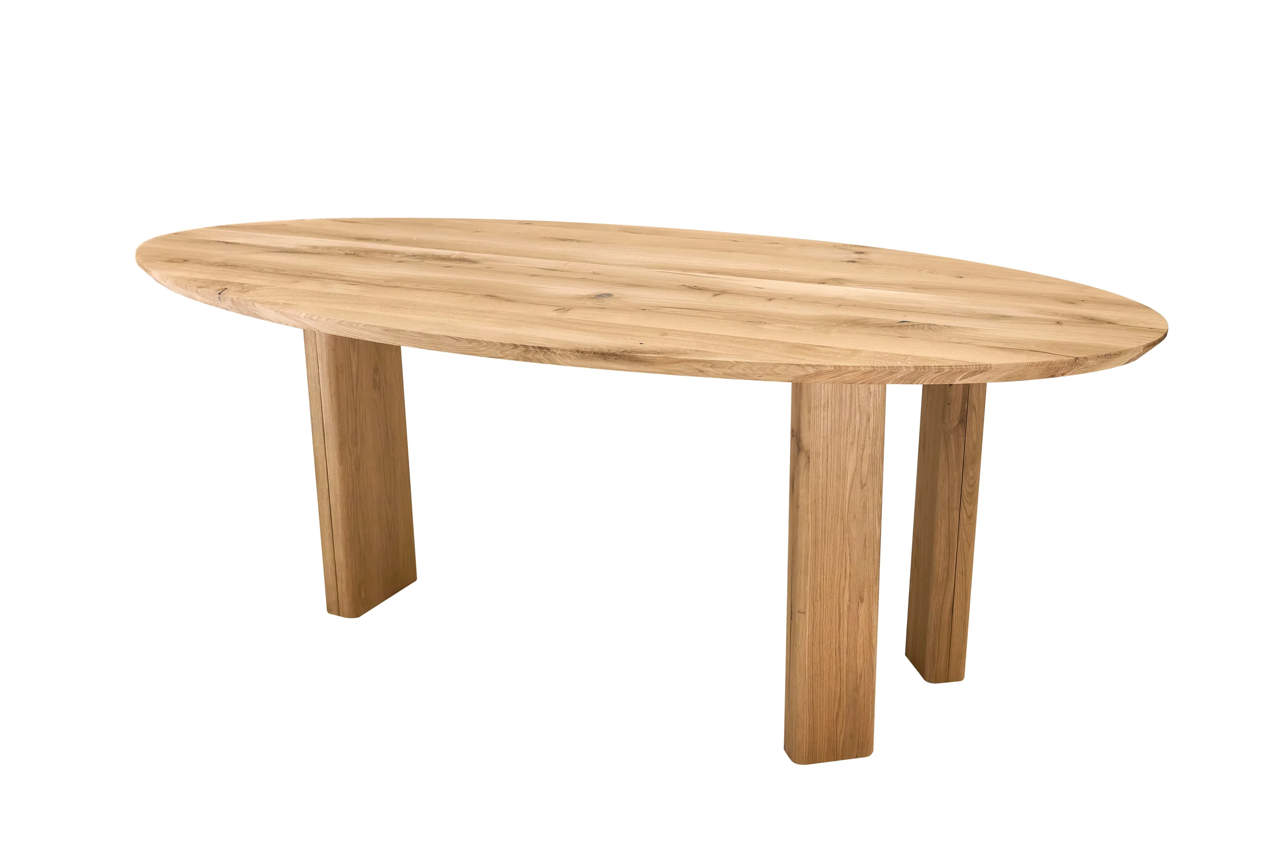 Een massief ovaal eiken tafelblad met facet rand brengt ambacht en elegantie samen.